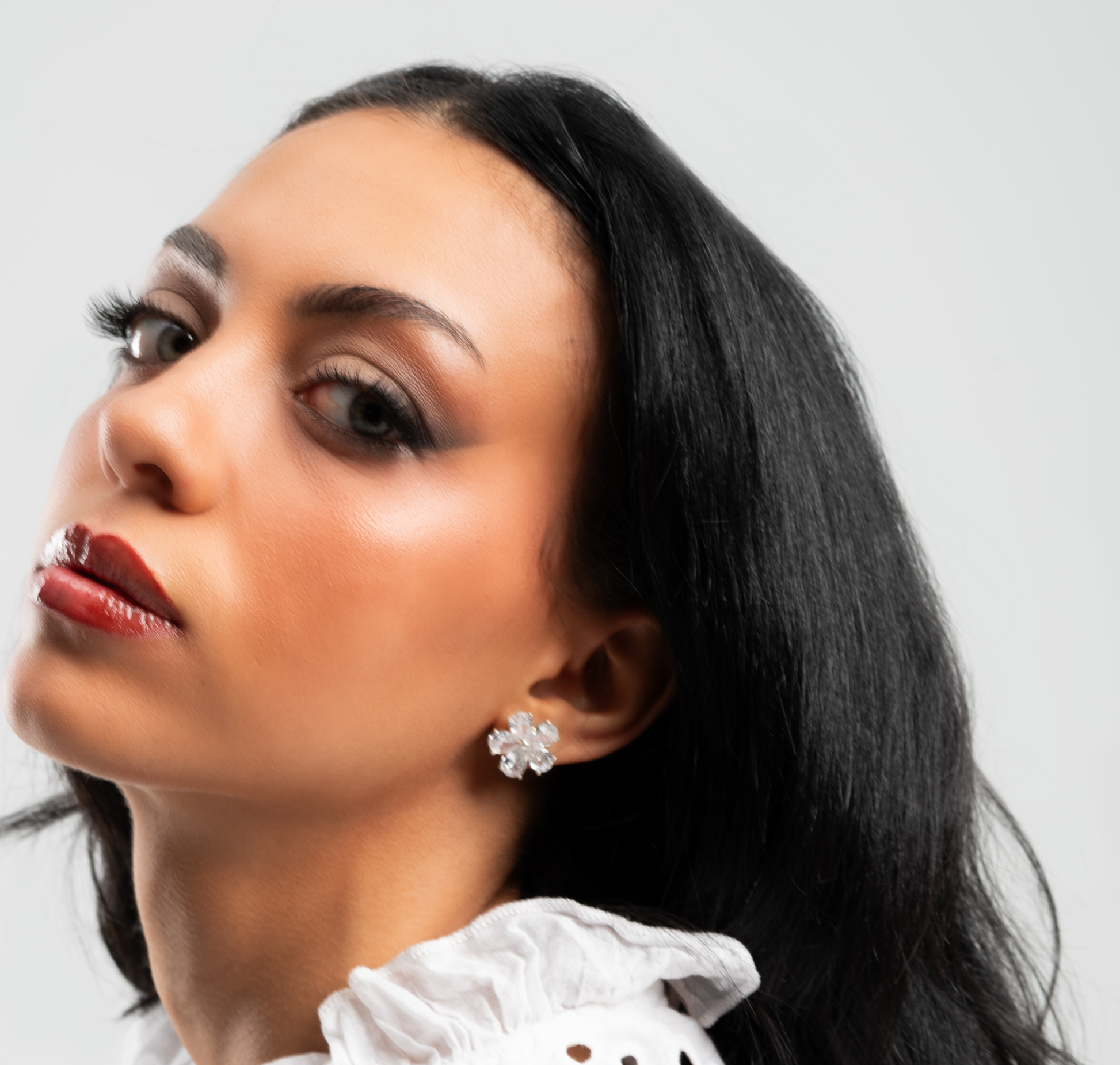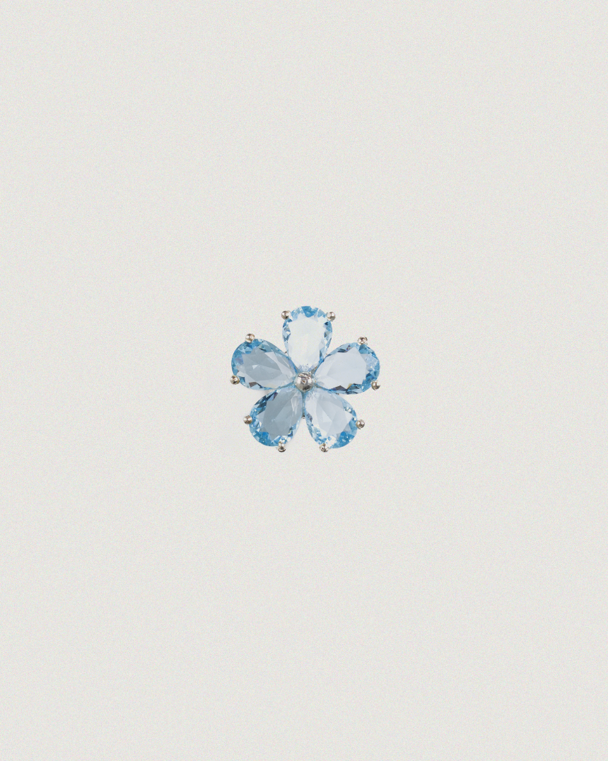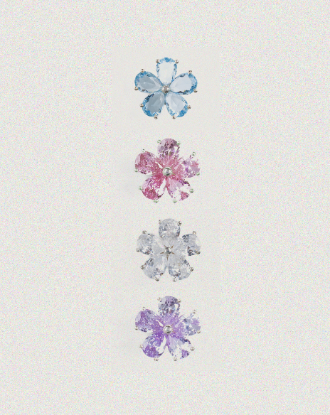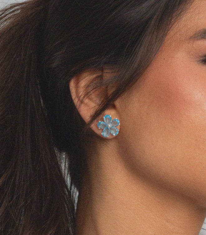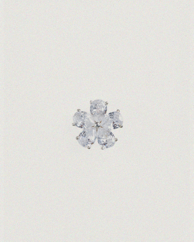 A playful stud, featuring a single five-petal 925 sterling silver exterior, set with select gemstones. Soft and subtle.